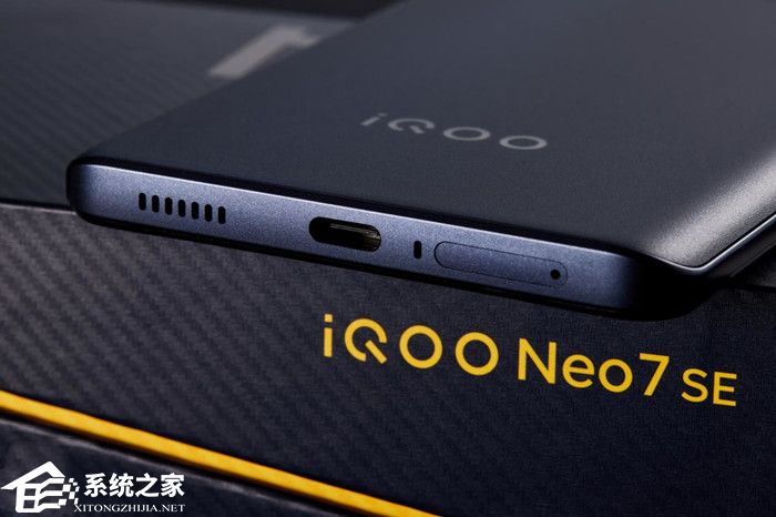 底部有 SIM 卡槽、充电口和扬声器开孔,因为 iQOO Neo 7 SE 采用的是封闭式立体双扬声器,所以另一枚扬声器藏于顶部中框与屏幕的交界处,如果不是近距离查看手机,很容易忽略这枚扬声器的存在。