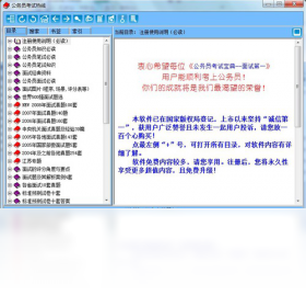 《公务员考试面试第一》软件收录:今年及以往年度,国家公务员和各地公务员的面试真题1000余套。不管你报考哪里的公务员,本软件中,一定能够找到当地以往的面试真题及答题要点,这对你的面试至关重要。除1000余套面试真题外,软件还收录了:面试模拟试题数十套、面试预测试题数十套、面试综合教程3套、面试考生及考官经验之谈数十篇、面试真题库及答案数百题、常规面试题型列举、各地公推公选面试数十套、各地事业单位面试数百套、各地选调生面试题数十套、500强企业面试精选、公务员面试必读、笔试必读、政策必读、笔试知识、企业面试。