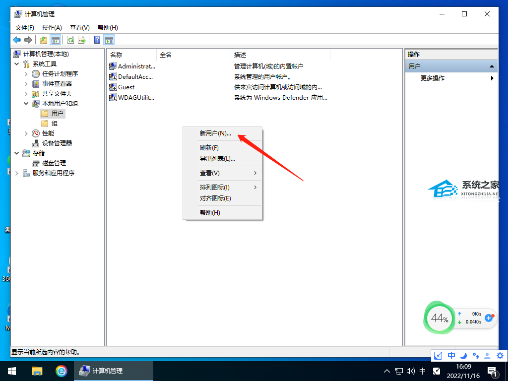 4、鼠标放在空白处右键打开选项选择“新用户”。