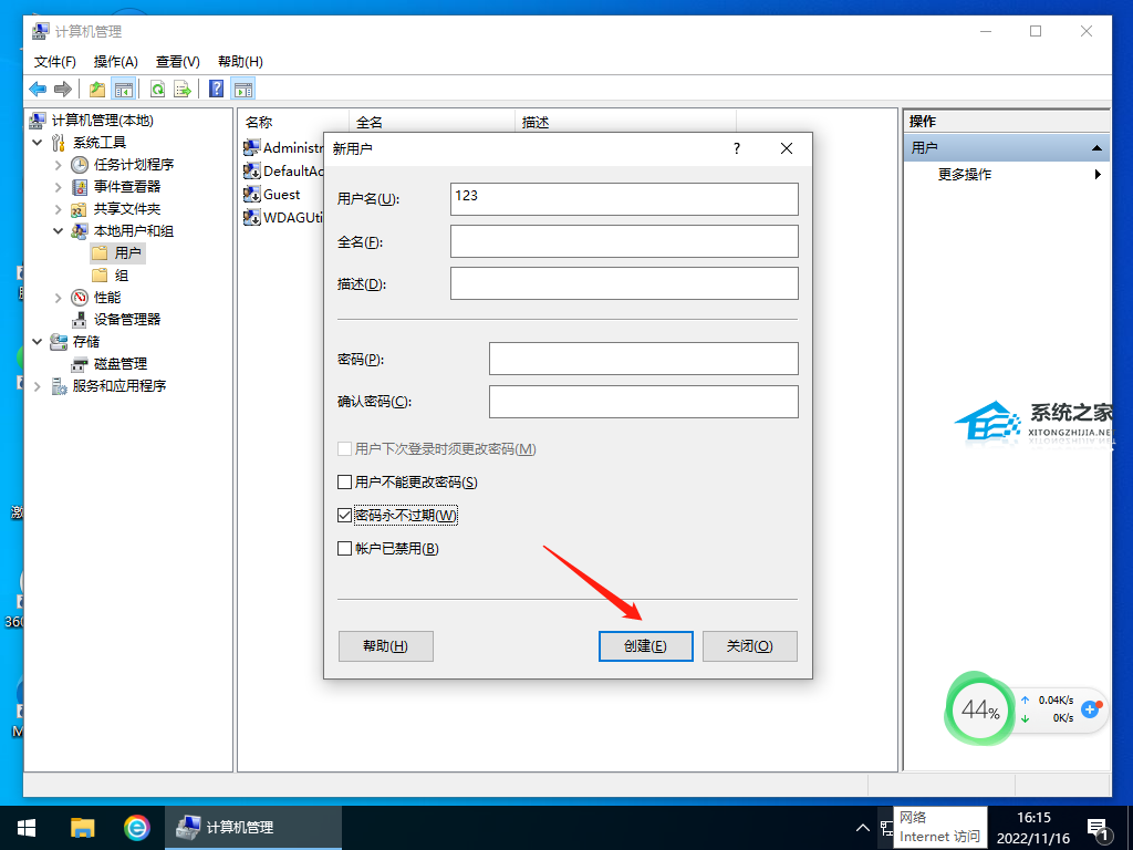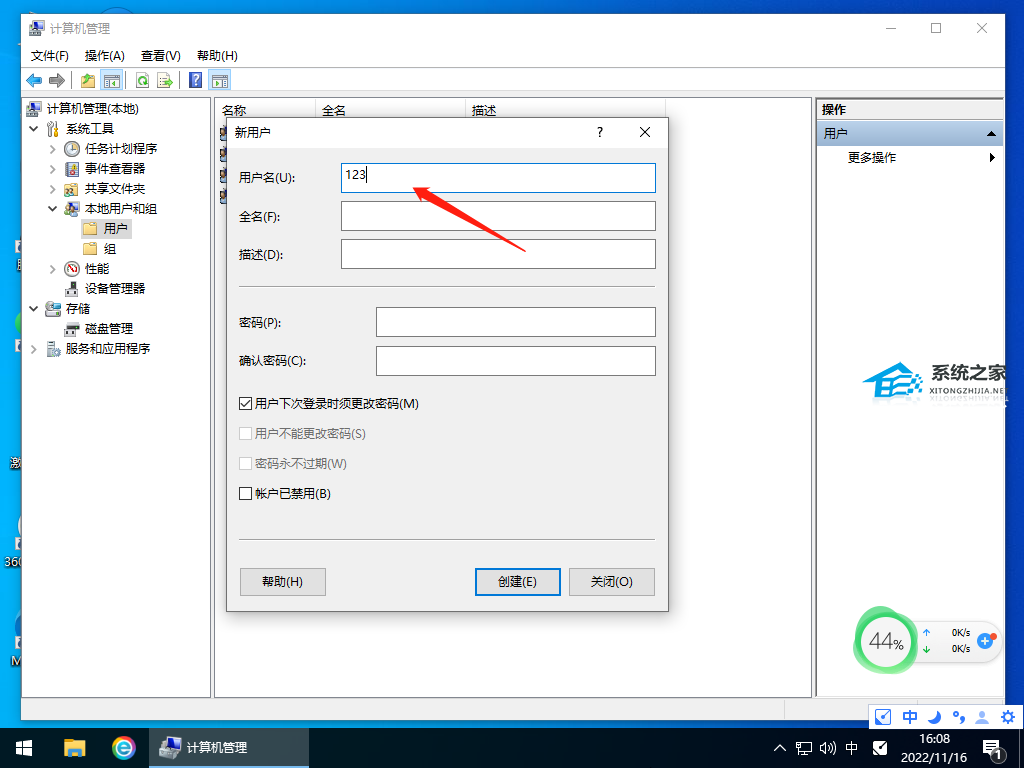 5、在“用户名”输入想要命名的用户名比如(123)。