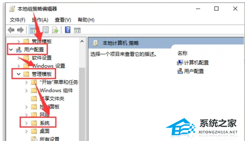 3、在本地组策略编辑器界面,依次点击打开“用户配置”--“管理模板”--“系统”。
