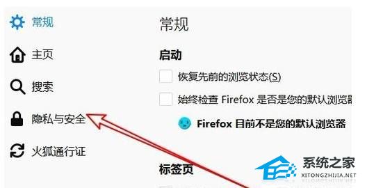 3、这时会进入火狐浏览器的选项页面,在页面左侧的菜单栏中点击切换到“隐私与安全”页面。