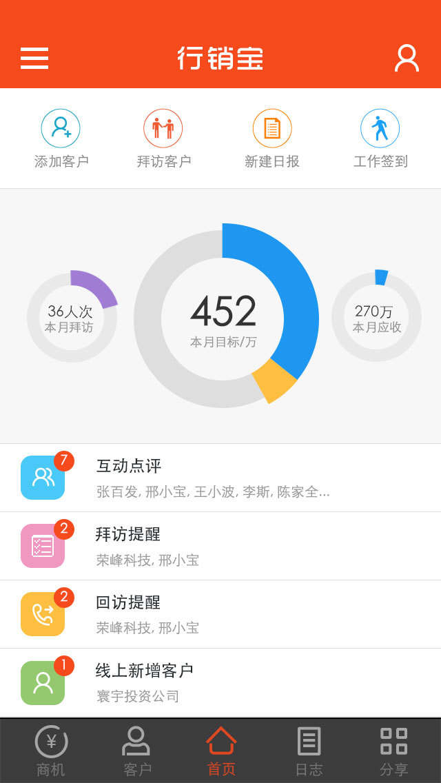行销宝是一款为销售人员打造的移动营销app,为您开启互联网销售新模式,让您随时随地了解行业数据,把握商机,做到事事清楚,是一款基于移动互联网的销售过程管理工具。