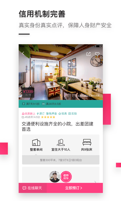 1、海量精品房源。在全球300座城市拥有超过20万套优质房源,包裹别墅、民宿、树屋、花店、剧院、书店等,让你充分体验住宿之美;
