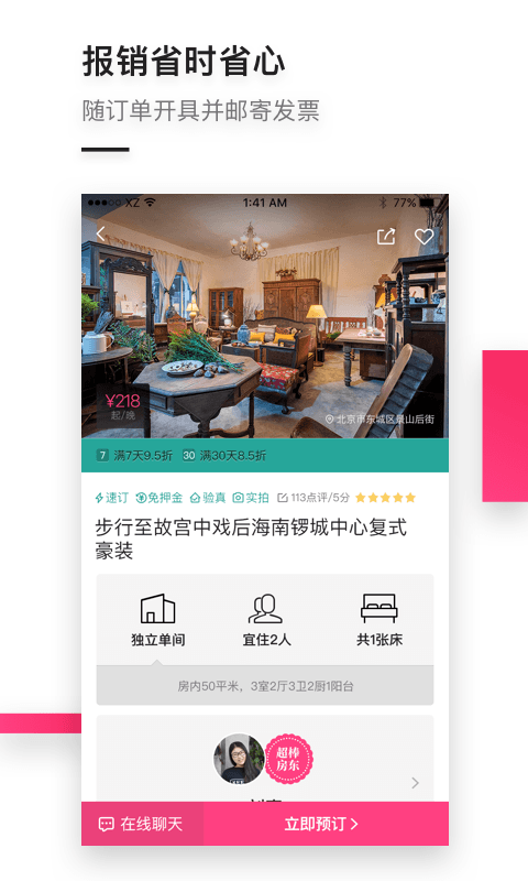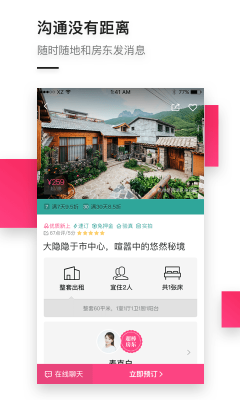 你可以随时随地打开小猪短租app,选择一个你喜欢的整租房源甚至是一个房间,你可以在上面查看到房源的照片,从房源的介绍和住客的评价中了解这个房源的全方位信息,你还可以和房东在线沟通交流,第一时间掌握这些短租房、民宿客栈的详情,轻松预订。你还可以向房东咨询当地最正宗的文化和特色的旅游信息,完美地规划自己的旅行路线,让你的旅程更加独特~
