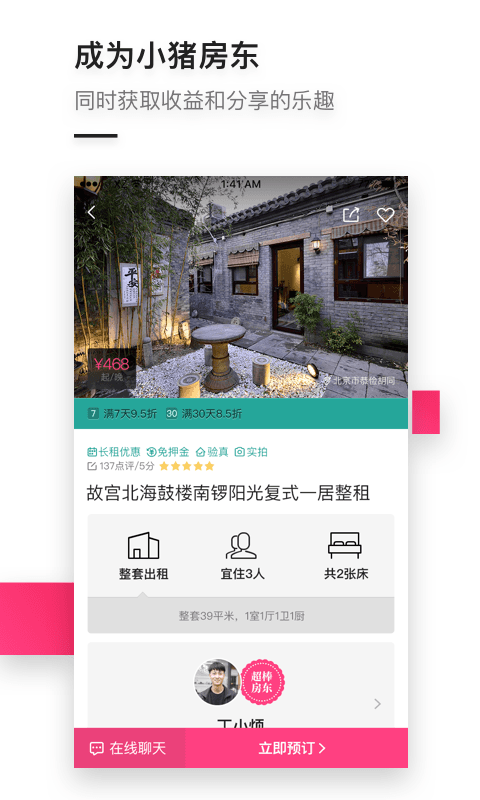 小猪是国内最大的特色民宿和短租房预订平台,也是一个温馨的社交住宿社区,在小猪短租app中,每个人都可以找到自己最喜欢的房源,不同的地方都充满着房东的热情。在小猪,你可以在不同的房间里找到像家一般的温暖,摒弃原有的出行住宿模式,拒绝冷冰冰的酒店,这里有最热情的房东和最温馨舒适的房源,让每个出门在外的游人都可以在陌生的城市有一个温暖的家。