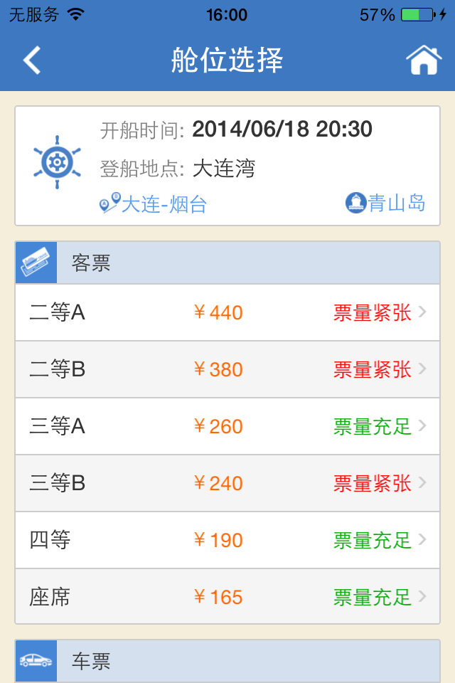 船票网由大连口岸物流网有限公司开发,是以大连港客滚船票销售业务为基础,结合客滚船票销售的自身特点,应用移动信息技术开发,面向广大乘船旅客提供船/车票信息查询、购票等服务的手机购票客户端,操作简单,使用便捷。