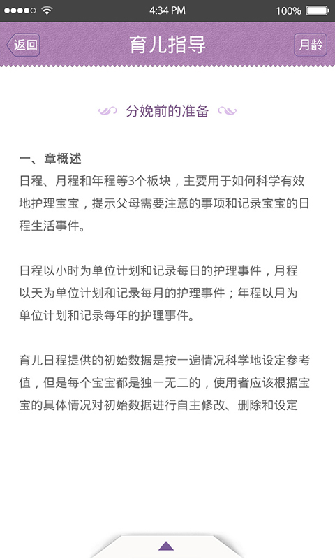 4.育儿指导:在随宝宝的年龄增长时,护理人可进入宝宝当时的月龄指导内容(本期概述、发育特点、饮食喂养、贴心护理、以及能力训练)进行学习,培养宝宝优质的生活习惯等。