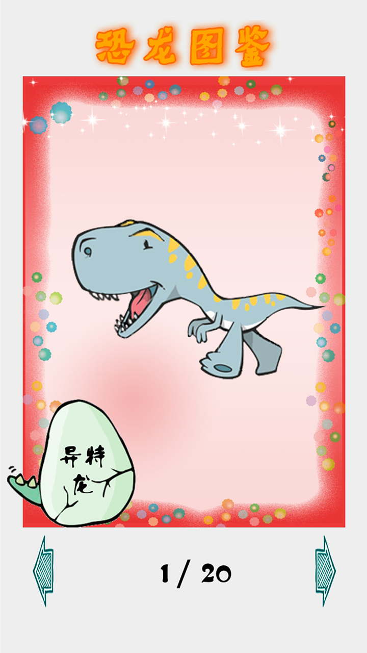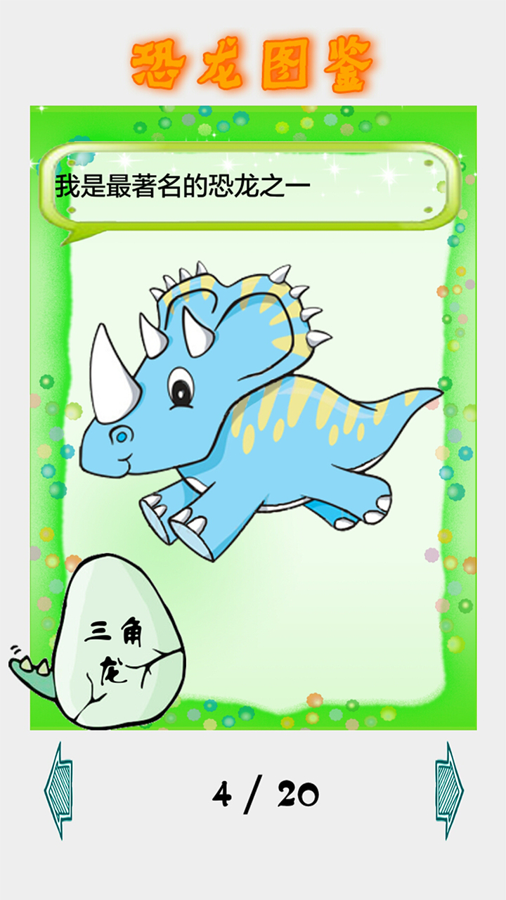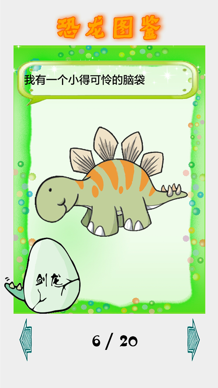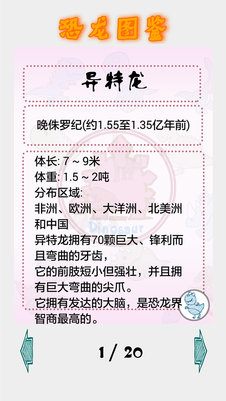 游戏介绍了一些有特色或者经常听到名字的恐龙,并且配有萌版恐龙图片。