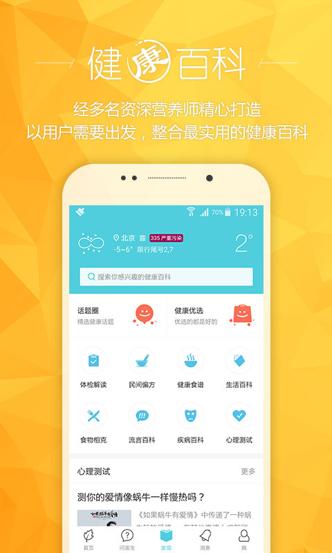 3、健康百科 实用工具 健康食谱、体检百科、民间偏方、疾病百科、流言百科、健康测评……一切以用户需要出发,整合实用的健康百科和工具,你想要的一点就知道。