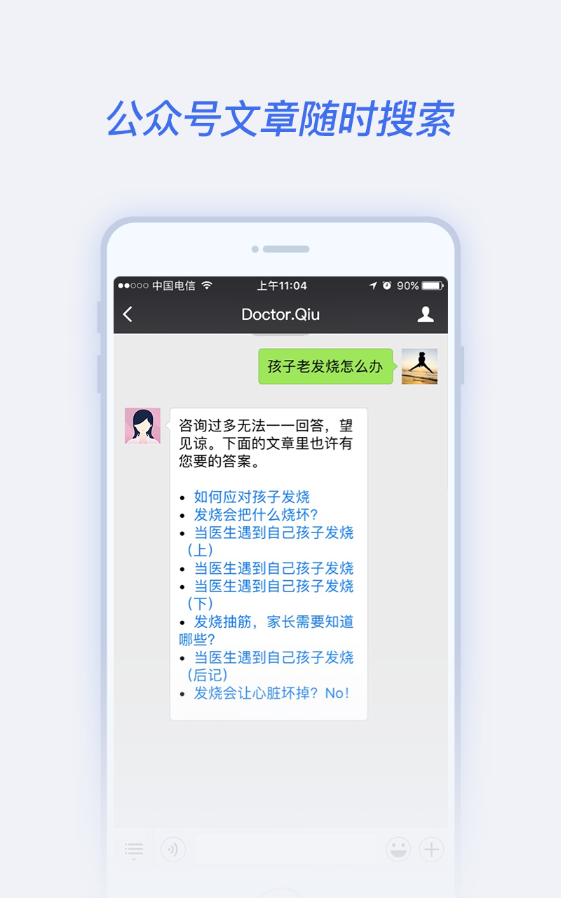 6、公众号智能应答、文章搜索等功能,方便患者自助查询历史科普文章。
