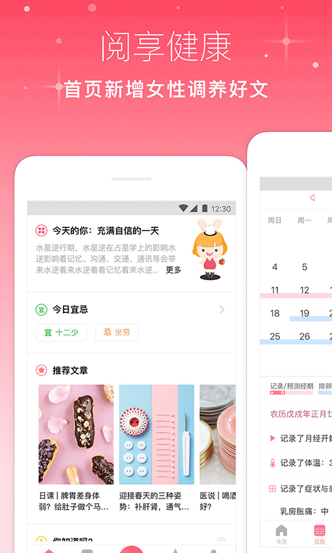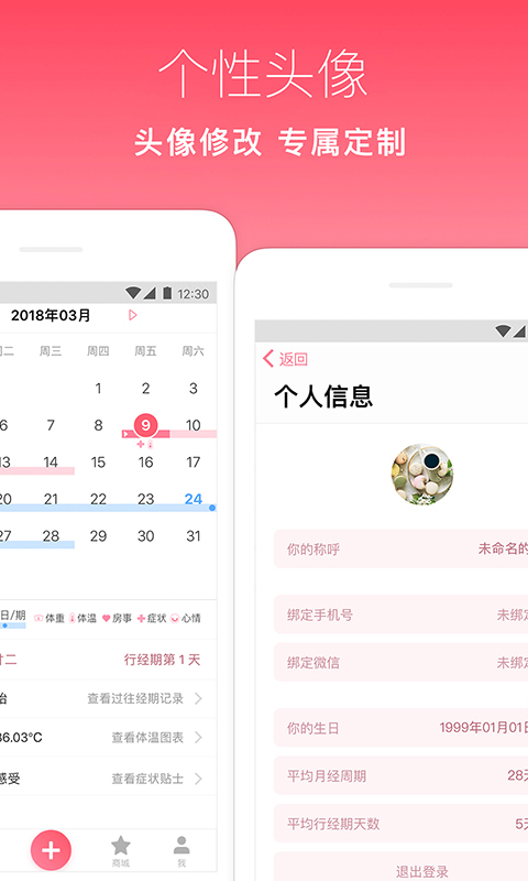 在这里你可以记录你的月经时间,异常症状,体重,体温等等,每一次简单的记录,智能系统都会为你计算出有针对性的建议。随着你记录的越多,智能系统将会不断学习,不断完善,推出更加贴切,更加准确的建议。