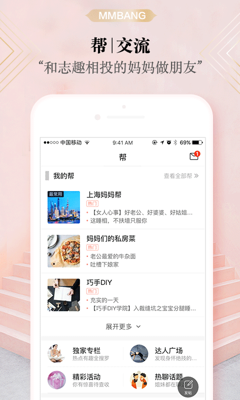 (2)兴趣爱好:妈妈们分享的精华内容汇总,私房菜做法、月子餐做法,儿童食谱,宝宝辅食大全,育儿宝典,编织,产检,产后恢复减肥瘦身,孕妈妈宝典,准孕妈妈宝典准妈妈手册,巧手手工diy,旅游、摄影、护肤、化妆、家居装饰、真正属于妈妈的圈子;