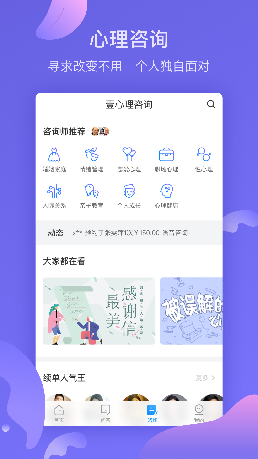 3、预约心理咨询:通过提供城市、价格和咨询方向等多维度的智能筛选,为你找到靠谱专业的心理咨询师,直接在线预约和支付,即可享受一对一的语音、视频或面对面咨询服务;