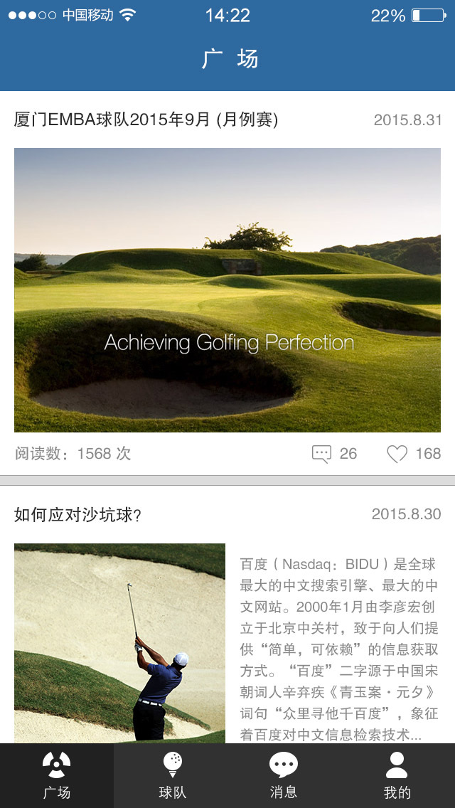 通过享玩,您可以更好的进行高球相关赛事、活动。享玩有赛事报名,球员分组,成绩录入,还有球队成员即时聊天等功能,您还可以在线预订附近的高球场地资源,教练资源。