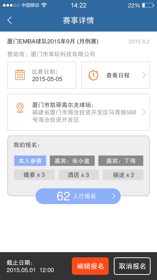 3.赛事报名:球员直接通过手机报名赛事,可报名内容包括是否参赛,是否携带嘉宾等。