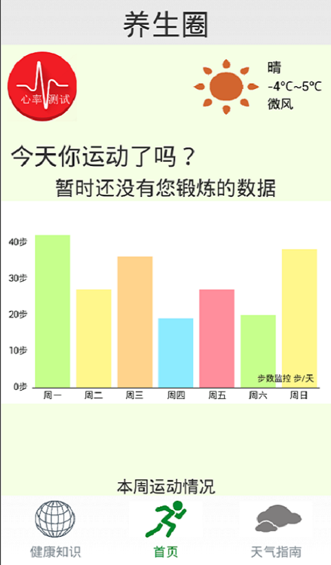 养生圈是一款集合运动、健康知识以及天气状况的综合类应用,其对于运动每天运气进行统计,对于当前所在城市以及其他城市的天气进行一个显示,以及对于健康知识的一个罗列。