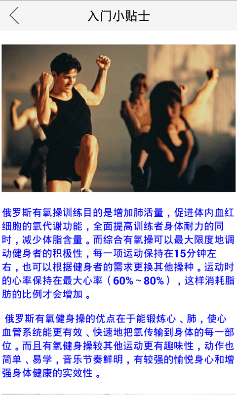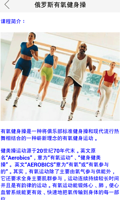 俄罗斯有氧健身操活动时间长、强度适中。并且对场地要求不高、四季都能练,还能有效控制体重,提高练习者各种身体素质,有氧锻炼能快速地把氧传输到身体的每一部位,使人体的心肺功能、耐力都可得到很大锻炼,是一种将俱乐部标准健身操和现代流行热舞相结合的一种崭新理念的有氧健身运动。