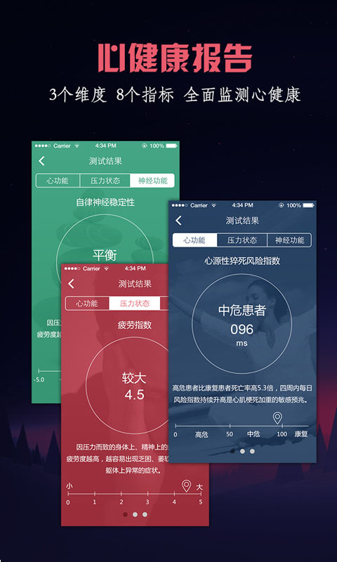 3. 全面:我们提供“平均心率”、“心梗康复指数”、“心脏抗压能力”、“运动负荷”、“精神压力”、“疲劳指数”、“自律神经平衡性”等7项生理指标,为您的心健康保驾护航! 对于急性心梗预后的人群,“心梗康复指数”提供鉴别心源性猝死风险的独立敏感预测指标。亚健康人群,通过3个维度、7个指标的测量,全面、及时的了解自己的身体状况。