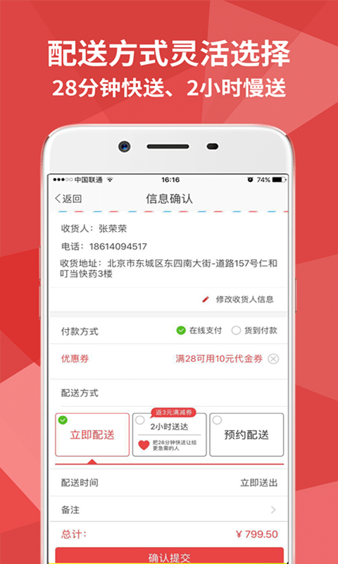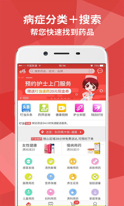 其他的医药App,一般都是以一小时送药上门为服务卖点,而叮当快药App则推出了“28分钟送到”的送药服务。为了确保能在28分钟内把药送到用户手中,不断的提炼。在实际交通情况下,通过不断的空跑测试和压力测试,划定药店的服务范围的电子围栏,并且制定了一套标准化的流程和考核体系,为合作药店提供专业的培训,这样就可保证28分钟免费送达。