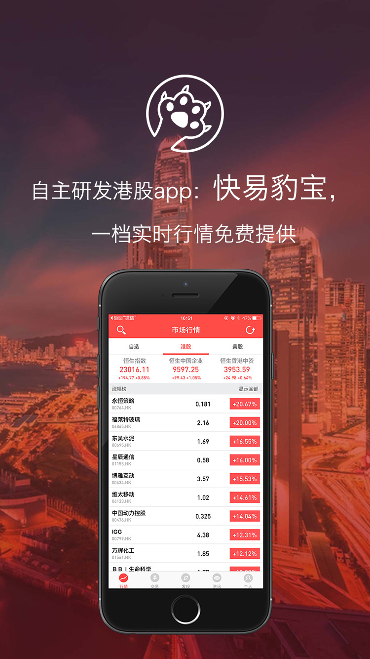 快易豹宝是国都快易专为广大投资者打造的炒股app,支持港股、美股两大市场交易!实时行情、智能条件交易、专业投资社区。还有全天不间断的中环直播资讯,是你玩转全球的炒股利器!