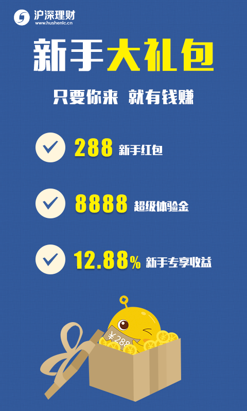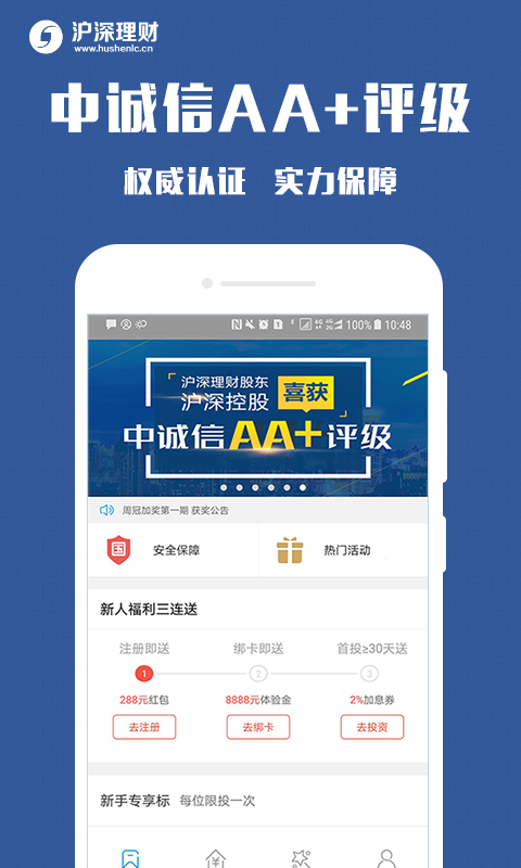 沪深理财是一款专业的金融理财平台,拥有强大的国资控股背景,让您理财无忧!100起投,还送288元红包,还在等什么?赶紧来理财吧!