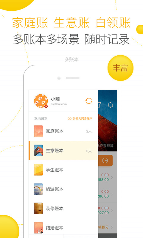 随手记可实现手机客户端和WEB数据实时同步,提供超支预警,个人周报,短信,邮件按时报告等人性化功能。