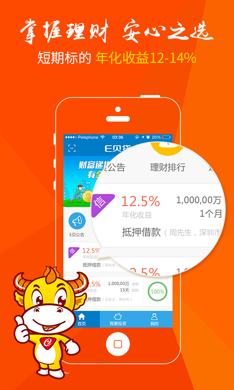 E贝贷app是一款非常专业的投资理财平台,致力于建设一个阳光、透明、专业的互联网金融平台,在这里你可以进行各类投资服务,掌握理财,稳定的提高自己的收入,主要服务于中小投融资群体,为理财客户提供借款客户的资信评估、还款管理、法律咨询、融资咨询等服务;为借款人提供低成本、方便简捷的资金解决方案。