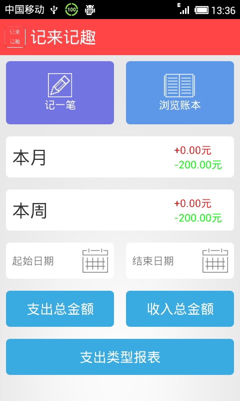 统计数据功能增加了本月和本周的收入与支出的统计显示,支出类型报表改用进度条显示。