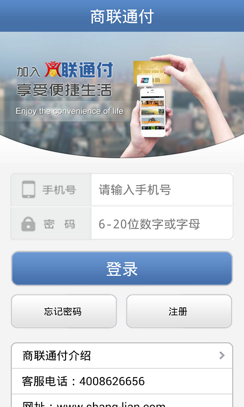 “商联通付”是商联在线有限公司的支付平台,通过该支付平台将在线金融中心、移动金融、电子商务、线下金融体验、社区金融服务等新兴技术模式加以整合,以最终满足金融机构、企业、个人的日益多元化的需求,实现“一站式综合金融服务”的服务平台。
