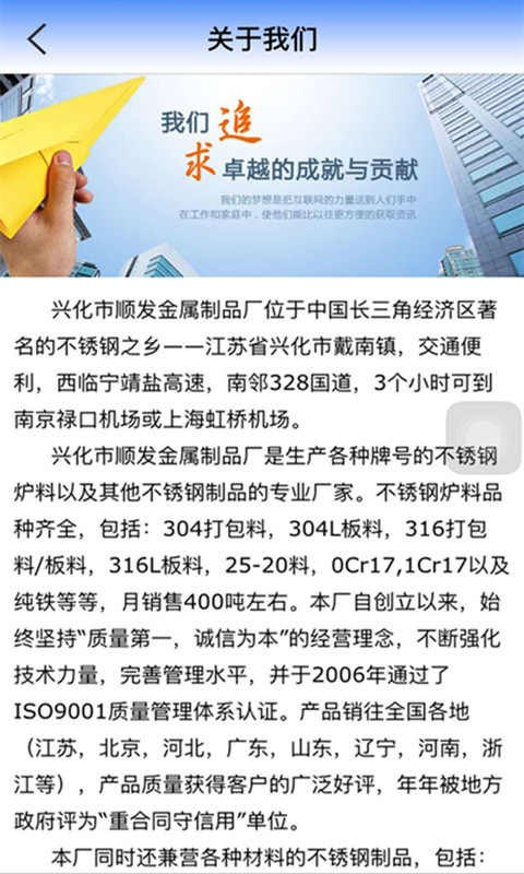 产品销往全国各地(江苏,北京,河北,广东,山东,辽宁,河南,浙江等),产品质量获得客户的广泛好评,年年被地方政府评为“重合同守信用”单位。 本厂同时还兼营各种材料的不锈钢制品,包括:不锈钢标准件,不锈钢棒材,不锈钢丝,不锈钢盘元,不锈钢钢锭,不锈钢板材以及不锈钢板材加工(剪板,折弯)等业务。