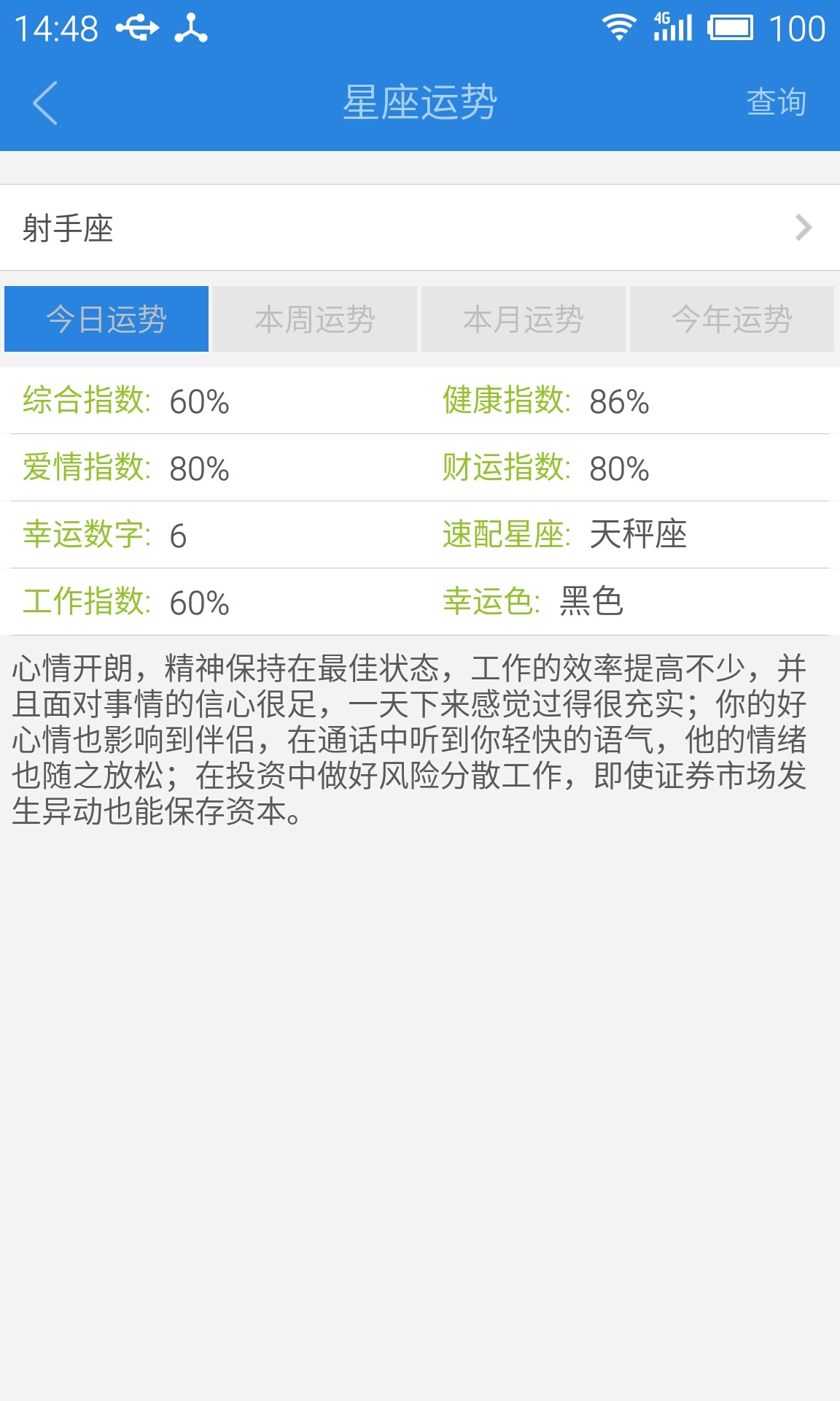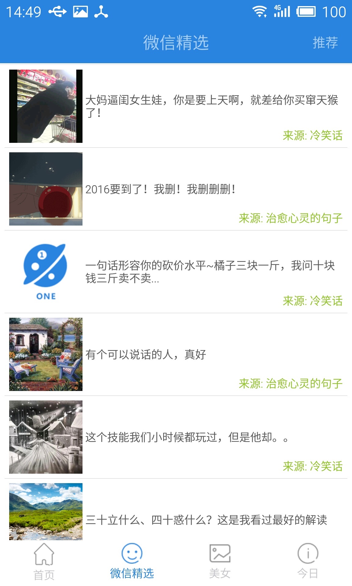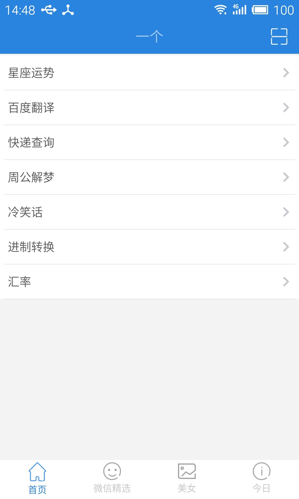 一个APP的目标是把小而全的功能汇聚到‘一个’里面来,目前主要功能有:星座运势、百度翻译、扫二维码、快递查询、周公解梦、冷笑话大全、进制转换、汇率、微信精选、美女图片、今日黄历、历史上的今天等等,功能这么多,总有‘一个’是你需要的。
