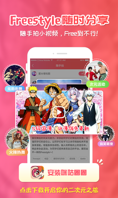 咪咕动漫改名咪咕圈圈啦!这款APP主要核心为动画、漫画、游戏、轻小说、原创视频,最近短视频频道又热辣上线了!不要怀疑咪咕的魅力,在这个番剧纵横的年代,“我”也可以撬动你的心!
