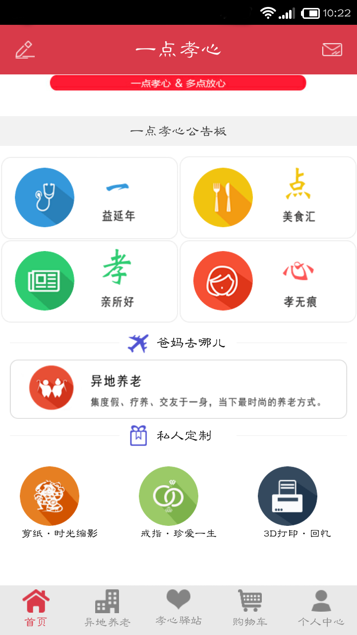 一点孝心app是一款专业的老年人服务软件,给用户提供了各种老年产品,功能齐全服务周到,您可以在一点孝心app上购买到最贴心的礼物,开启您的尽孝之旅,结合自身多年养老实践经验,专门打造的集“老年服务”“老年产品”“私人订制”“异地养老”于一身的专业养老线上平台,手机就能尽孝心,海量产品、服务线上选。