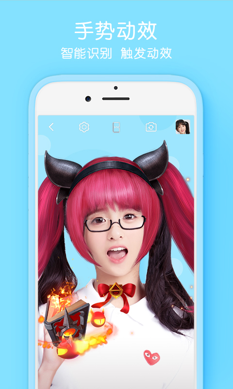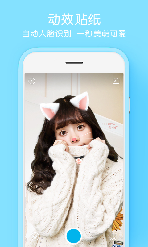 2、【动效贴纸】强大动效贴纸库,自动人脸识别,一秒美萌可爱,超丰富的动效贴纸库!