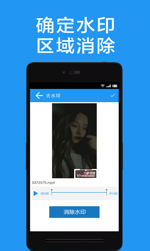 进入应用之后点击“开始”,选择想要进行操作的视频; 切记:打开相关视频之后,用去水印的操作白框移动选定画面中想要去除的部分; 然后点击“消除水印”按键,应用即会自动开始操作,静候片刻,你想要的效果就会呈现,然后还可以预览操作后的效果哦! 在操作完成时,如果预览之后感觉不满意,用户还可以点击右上角删除应用重新再来! 已经完成去除的视频将会自动以副本的形式保存在“我的视频”目录下,存放地址和其他本地视频文件相同,以供随时调用!