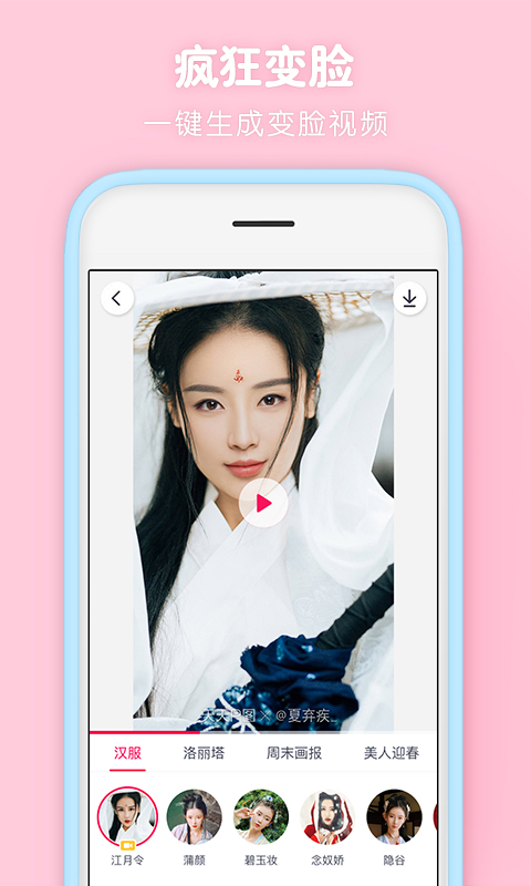 实时人脸识别,丰富多样的换脸角色,火箭般的更新速度。媚娘装、小学生照、军装照,让你一键秒变大明星,疯狂变脸等你来体验。