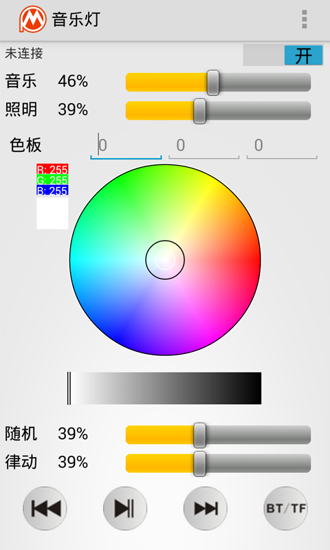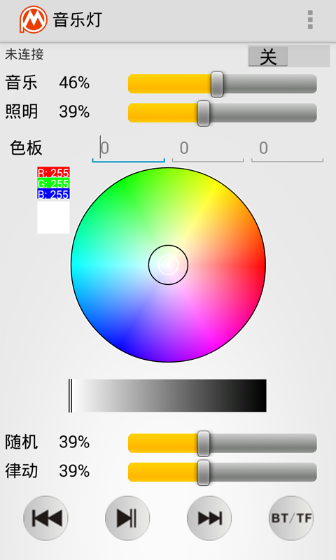 音乐灯是一款蓝牙律动的音乐灯,灯的颜色有白,红,蓝,绿等,与蓝牙设备连接后,可播放音乐,调节灯光颜色,灯色可随音乐的强度及节律变化,适合家庭,会场,KTV等娱乐场所,方便实用,为枯燥的氛围增添点乐趣,操作容易,是一款家人朋友聚会不可少的软件。