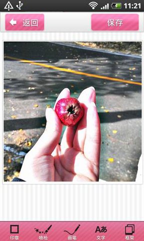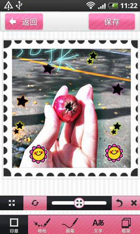 装饰后的照片可以直接保存到手机里,也可以马上上传到人人网,新浪微博里,特别方便。