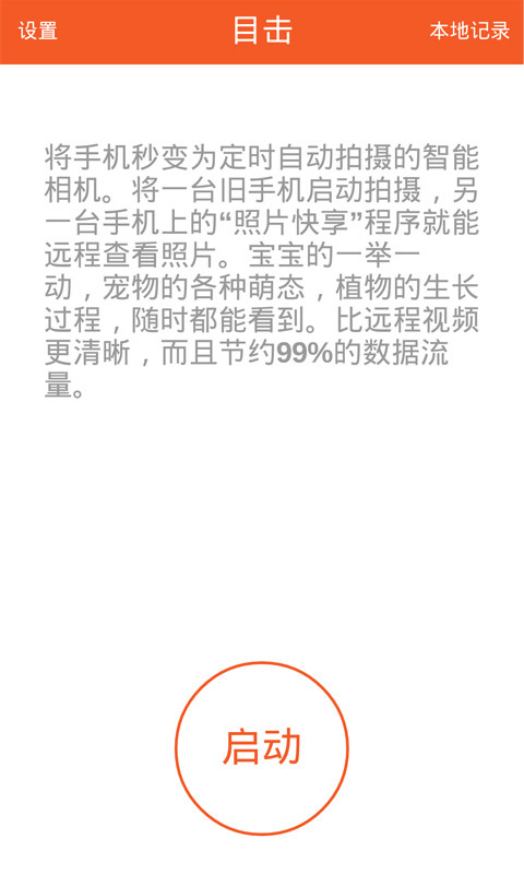 目击是一款可以将手机秒变为定时自动拍摄的智能相机,将一台旧手机启动拍摄,另一台手机上的“照片快享”程序就能远程查看照片,宝宝的一举一动,宠物的各种萌态,植物的生长过程,随时都能看到,比远程视频更清晰,而且节约99%的数据流量。(部分手机支持)