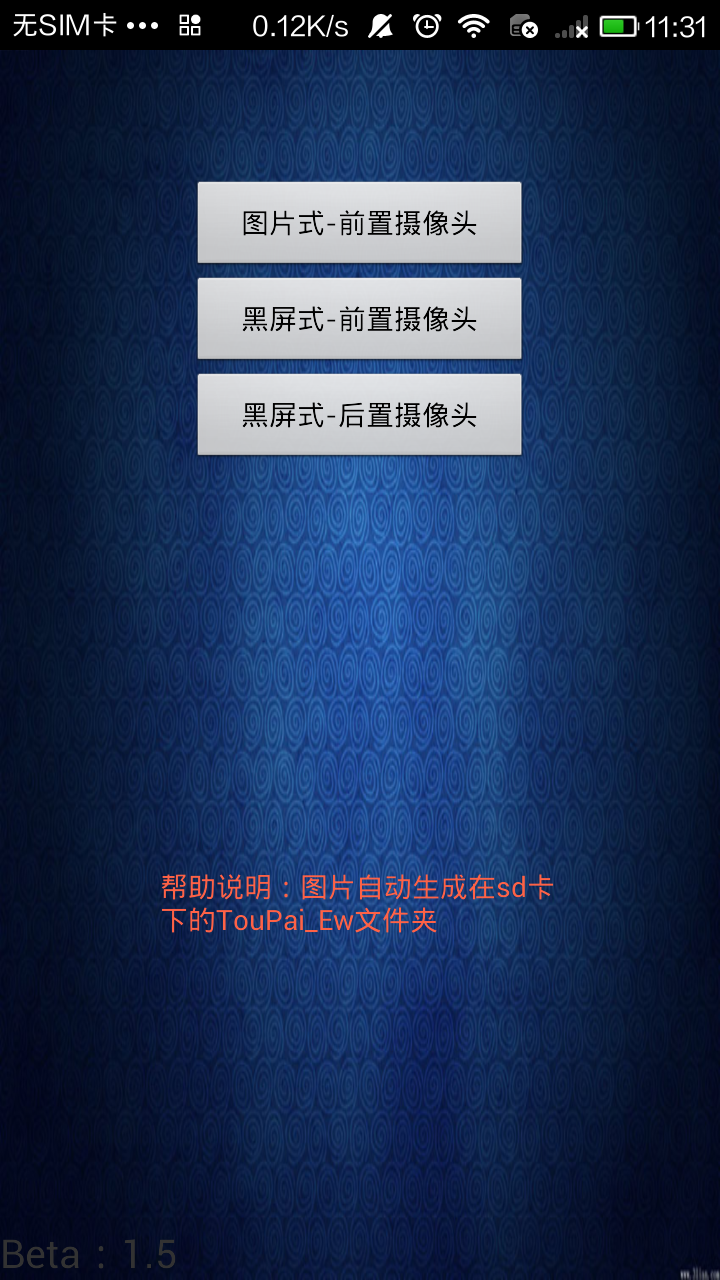 偷拍达人是一款偷拍神器,让你可以光明正大的进行偷拍,风趣的图片式偷拍,能够捕捉对方开心的一瞬间,黑屏式偷拍,走到哪拍到哪,让你可以随心所欲淡定进行偷拍!所有照片都保存在sd卡下的TouPai_Ew文件夹下,后面会推出更多有意思的偷拍模式。