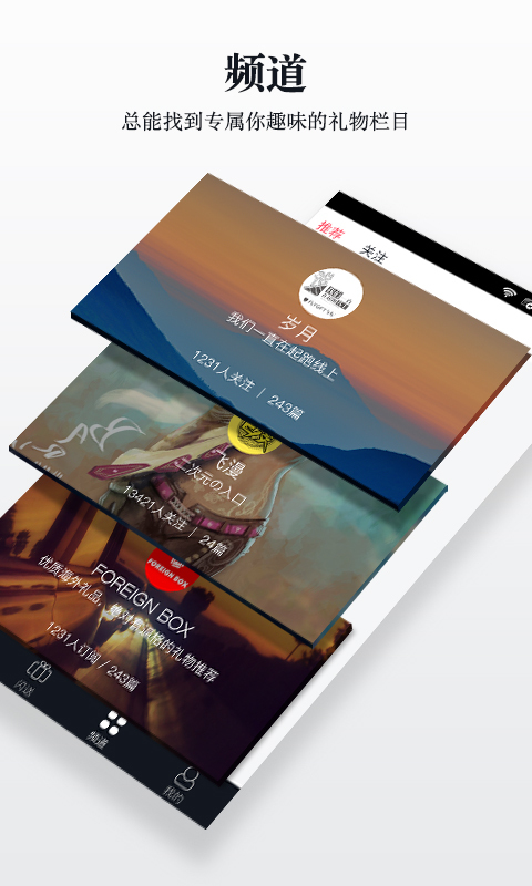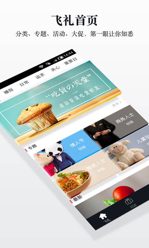 飞礼是一个针对90后年轻人的礼物电商app,它以精准的算法和神秘礼物的方式为目标用户推送高品质和高逼格的良品礼物,倡导一种“随时随地表达爱“的生活态度,致力于带给用户一种全新的送礼体验,送礼不在于礼物本身,而是分享的喜悦与惊喜的感动,并且,我们希望通过礼物的方式,鼓励用户不断强化强社交关系间的互动,最终形成一个强社交关系的互动平台。
