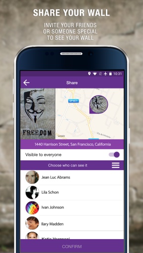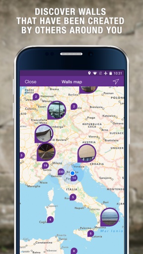 在墙上留下一条信息,或者其它于真实世界中的地方,并选择你想分享给的人看,在公共场所中留下私人信息是一件很有趣的事情,拍下你身边的一张照片,在其中加入图片或者涂鸦并分享给你的朋友,你的朋友将会在此处附近并以增强现实技术来观看你留下的信息,你还可以设置你的信息为公共查看,因此所有经过的人都可以通过WallaMe应用来查看。