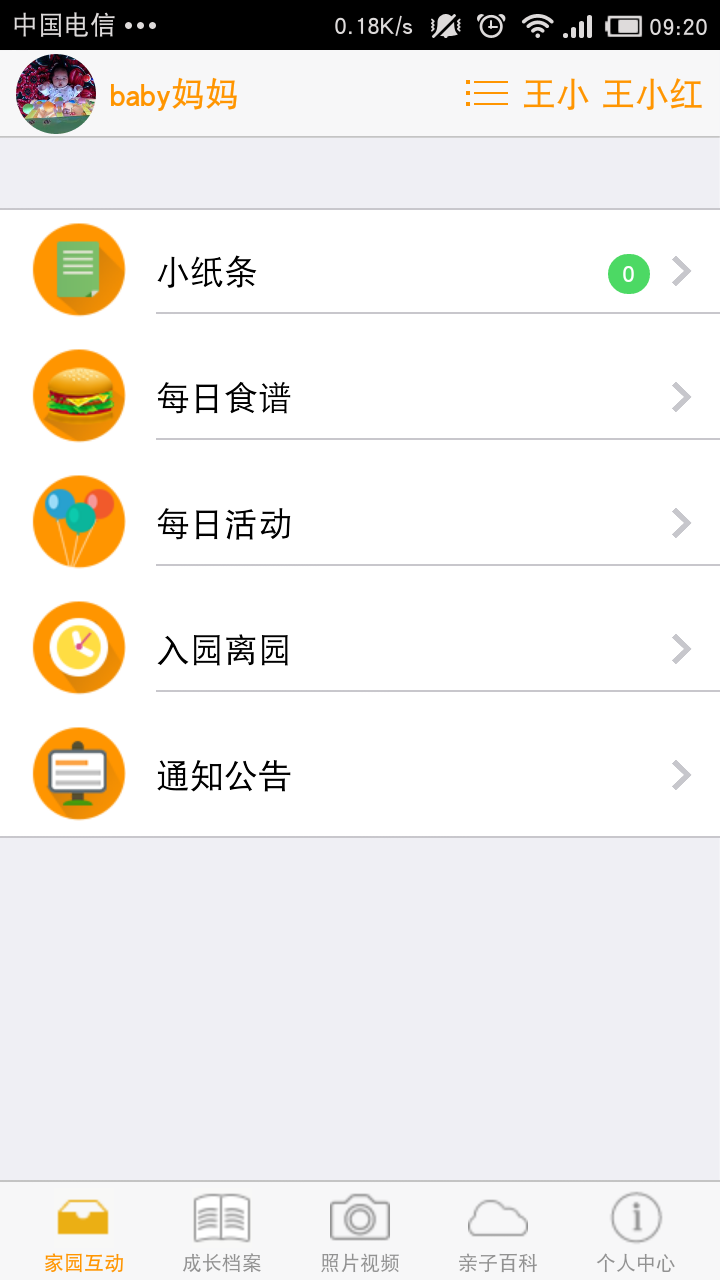 家园互动:主要解决老师与家长信息沟通的问题,包括各种通知、课程食谱、新闻公告、以及即时信息的小纸条,考勤部分可独立操作,也可根据需要配合考勤机使用,用来统计儿童的入园离园情况。