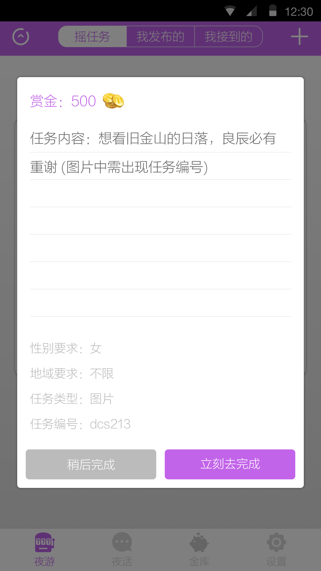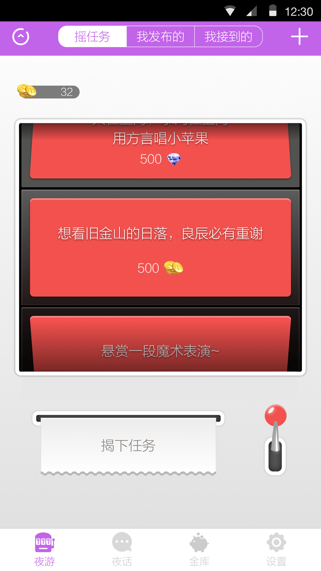 这里有全球各地成千上万条真实网友发布的稀奇古怪的悬赏任务,拨动一下邪恶tiger机,对着手机说句话\/拍张照\/录段视频,真金白银的赏金即刻到手。没有你想不到,只有你不敢做。