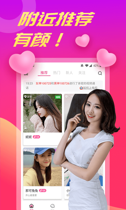 比翼聊APP安卓版,是一款单身年轻男女的社交软件。比翼聊APP安卓版让单身你能够快速脱单的交友聊天软件,这个软件非常适合看颜值的朋友,因为这里可以视频聊天,看对眼了再继续聊吧。比翼聊APP安卓版让你快速结束单身。