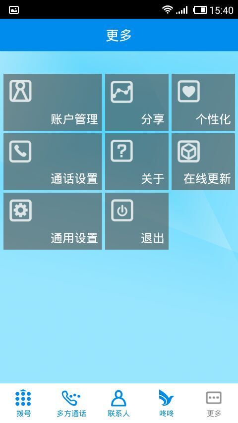6、账号管理、找回密码、修改密码、最近通话记录、分享、检测更新、意见反馈、更换皮肤等。