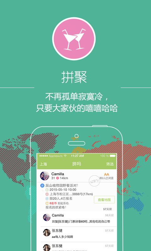 拼聚会:周末想唱k,想旅游,想聚餐。人不够?可以一键发布拼聚,*短时间聚集周围陌生人。