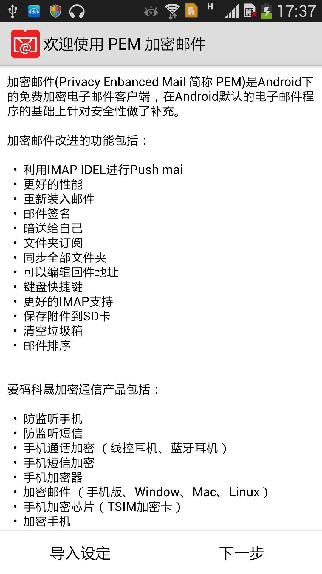 加密邮件(Privacy Enbanced Mail 简称 PEM)是Android下免费加密电子邮件客户度,在Android默认电子邮件应用的基础上针对安全性做了有效补充,有效整合安卓OpenPGP进行邮件加密与签名服务。