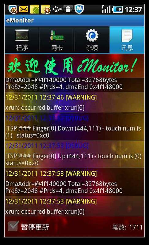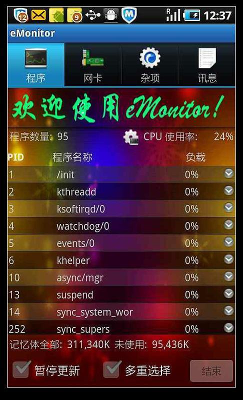 eMonitor软件可以监控你手机软件的所有程序的运行情况,例如占用内存的大小、线程数及现在的状态等等,你也可以结束程序、查看CPU的使用率和程序数,如果你获得root权限就可以杀死系统的程序,解决您为无用的系统程序而解决不了的困扰。